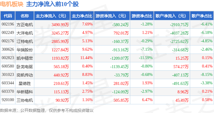 从资金流向上来看,当日电机板块主力资金净流入6519.41万元,游资资金净流入87.53万元,散户资金净流出6606.94万元。电机板块个股资金流向见下表:
