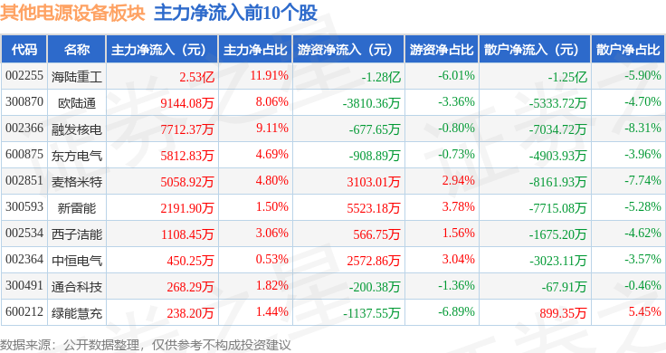 从资金流向上来看,当日其他电源设备板块主力资金净流入3.56亿元,游资资金净流出7913.6万元,散户资金净流出2.77亿元。其他电源设备板块个股资金流向见下表: