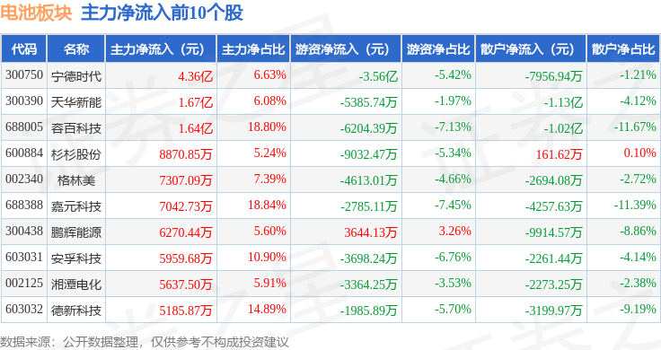 从资金流向上来看,当日电池板块主力资金净流入6.53亿元,游资资金净流出6.78亿元,散户资金净流入2488.82万元。电池板块个股资金流向见下表: