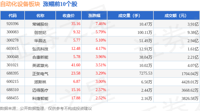 证券之星消息,12月19日自动化设备板块较上一交易日上涨0.79%,常辅股份领涨。当日上证指数报收于3890.45,上涨0.36%。深证成指报收于13140.22,上涨0.66%。自动化设备板块个股涨跌见下表: