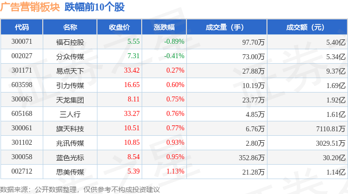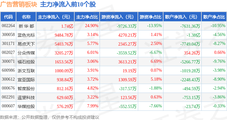 从资金流向上来看,当日广告营销板块主力资金净流入1.26亿元,游资资金净流入1.39亿元,散户资金净流出2.65亿元。广告营销板块个股资金流向见下表: