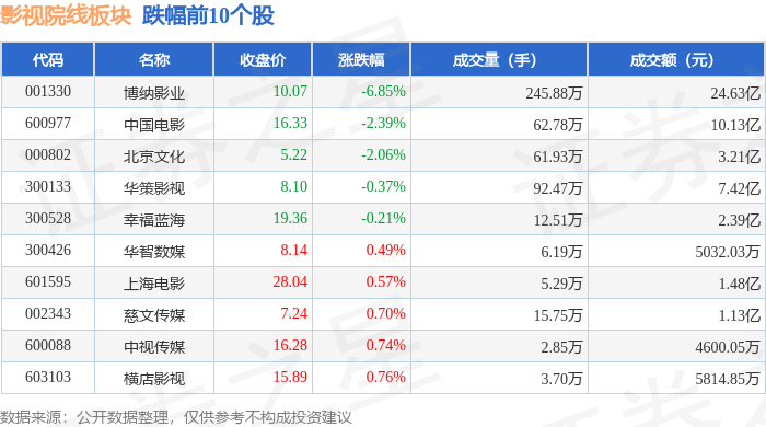 证券之星消息,12月19日影视院线板块较上一交易日下跌0.05%,博纳影业领跌。当日上证指数报收于3890.45,上涨0.36%。深证成指报收于13140.22,上涨0.66%。影视院线板块个股涨跌见下表:
