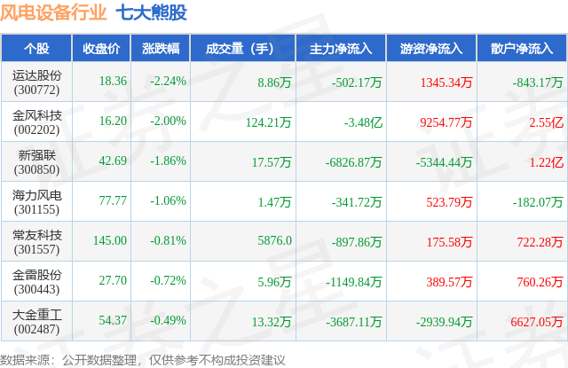 个股表现方面,风电设备行业当日领跌股为运达股份(300772),该股当日报收18.36,下跌2.24%,成交量8.86万,主力资金净流出502.17万元。金风科技(002202)以下跌2.0%紧随其后,该股当日成交量124.21万,主力资金净流出3.48亿元。除此之外,新强联(300850)、海力风电(301155)、常友科技(301557)均进入当日熊股之列。具体个股列表见下表: