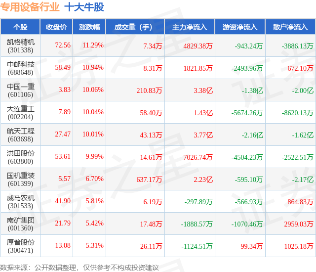 个股表现方面,专用设备行业当日领涨股为凯格精机(301338),该股当日报收72.56,上涨11.29%,成交量7.34万,主力资金净流入4829.38万元。中邮科技(688648)以上涨10.94%紧随其后,该股当日成交量8.31万,主力资金净流入1821.85万元。除此之外,中国一重(601106)、大连重工(002204)、航天工程(603698)均进入当日牛股之列。具体个股列表见下表: