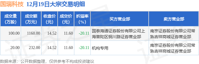 证券之星消息,12月19日国瑞科技发生大宗交易,交易数据如下: