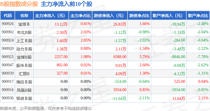 资金流向方面,B股指数(000003)成份股当日主力资金净流出合计45.74万元,游资资金净流入合计12.81万元,散户资金净流入合计32.93万元。成份股资金流向详情见下表: