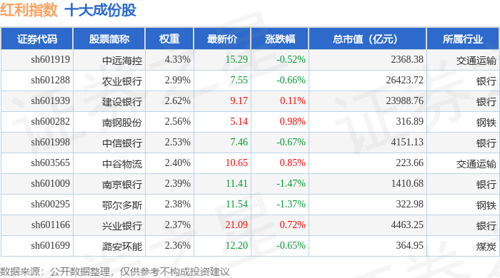证券之星消息,12月19日,红利指数(000015)报收于3028.69点,跌0.17%,成交264.99亿元,换手率0.2%。当日该指数成份股中,上涨的有19家,中粮糖业以3.62%的涨幅领涨,下跌的有28家,中国海油以2.73%的跌幅领跌。