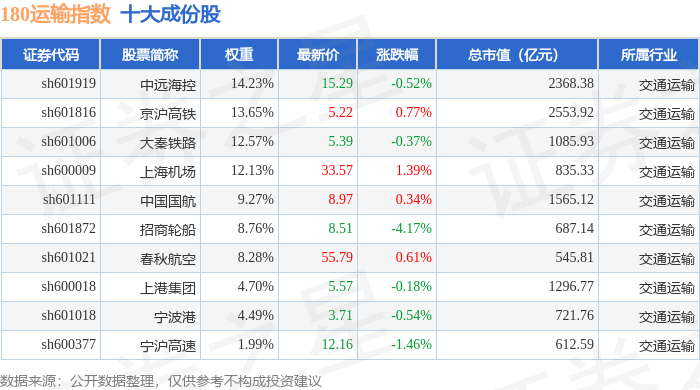 证券之星消息,12月19日,180运输(000027)指数报收于773.5点,跌0.19%,成交51.26亿元,换手率0.33%。当日该指数成份股中,上涨的有5家,上海机场以1.39%的涨幅领涨,下跌的有7家,招商轮船以4.17%的跌幅领跌。