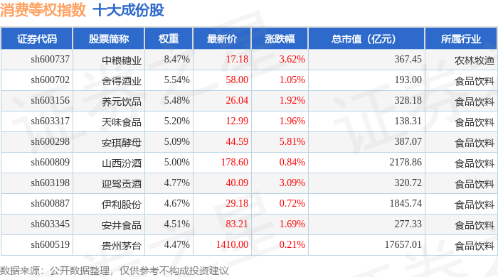 消费等权(000074)指数十大成份股详情如下: