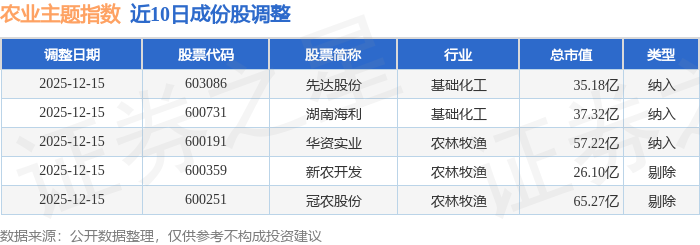 近10日内农业主题(000122)指数成份股做了调整,新纳入了3只股票,剔除了2只股票。