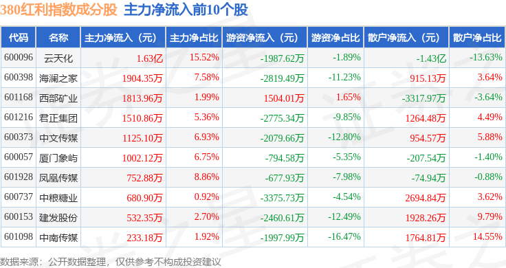 资金流向方面,380红利(000150)指数成份股当日主力资金净流入合计2810.84万元,游资资金净流出合计1.32亿元,散户资金净流入合计1.04亿元。成份股资金流向详情见下表: