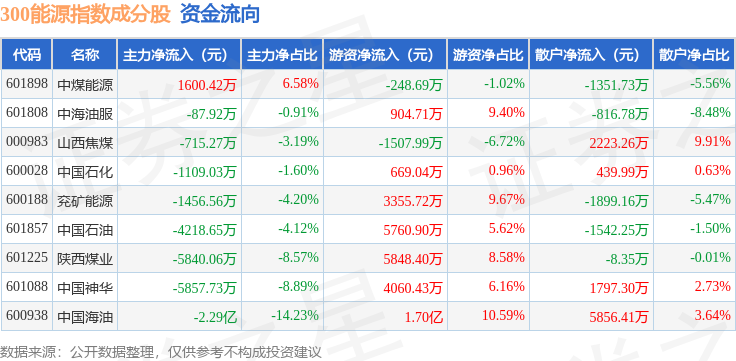 资金流向方面,300能源(000908)指数成份股当日主力资金净流出合计4.06亿元,游资资金净流入合计3.59亿元,散户资金净流入合计4698.7万元。成份股资金流向详情见下表: