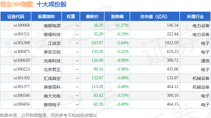 证券之星消息,12月19日,创业300(399012)指数报收于4383.88点,涨0.47%,成交2467.68亿元,换手率2.72%。当日该指数成份股中,上涨的有216家,航天智造以16.3%的涨幅领涨,下跌的有81家,南都电源以11.37%的跌幅领跌。
