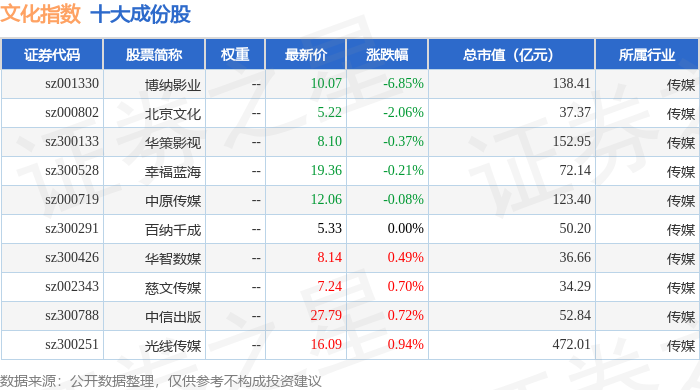 证券之星消息,12月19日,文化指数(399248)报收于906.18点,涨0.65%,成交85.76亿元,换手率4.22%。当日该指数成份股中,上涨的有18家,荣信文化以6.12%的涨幅领涨,下跌的有5家,博纳影业以6.85%的跌幅领跌。