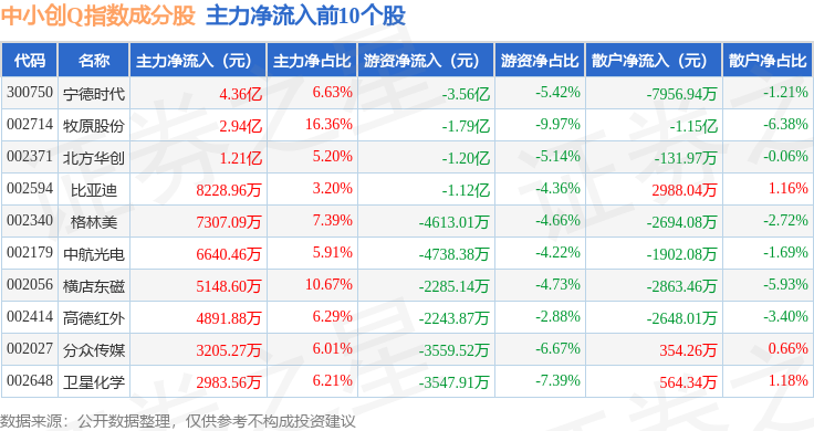 资金流向方面,中小创Q(399294)指数成份股当日主力资金净流入合计4.5亿元,游资资金净流出合计9.2亿元,散户资金净流入合计4.7亿元。成份股资金流向详情见下表: