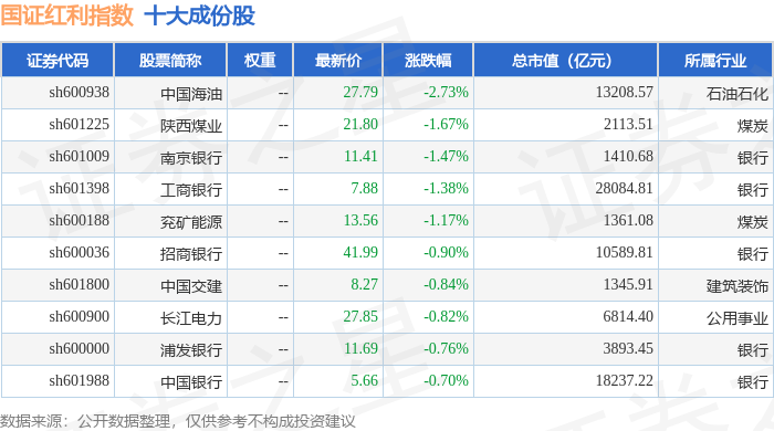 国证红利(399321)指数十大成份股详情如下:
