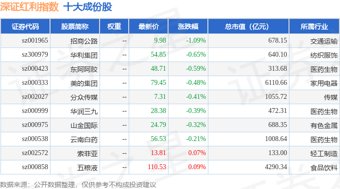 证券之星消息,12月19日,深证红利(399324)指数报收于9188.44点,涨0.8%,成交245.07亿元,换手率0.75%。当日该指数成份股中,上涨的有32家,藏格矿业以6.56%的涨幅领涨,下跌的有8家,招商公路以1.09%的跌幅领跌。
