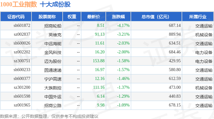 1000工业(399383)指数十大成份股详情如下:
