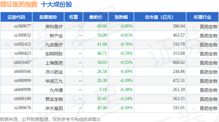 证券之星消息,12月19日,国证医药(399394)指数报收于8719.47点,涨1.26%,成交339.77亿元,换手率1.7%。当日该指数成份股中,上涨的有68家,益方生物以8.06%的涨幅领涨,下跌的有12家,英科医疗以0.86%的跌幅领跌。