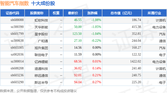 智能汽车(399432)指数十大成份股详情如下: