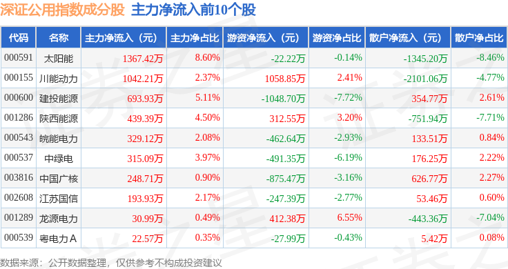 资金流向方面,深证公用(399622)指数成份股当日主力资金净流出合计1724.02万元,游资资金净流入合计889.78万元,散户资金净流入合计834.24万元。成份股资金流向详情见下表: