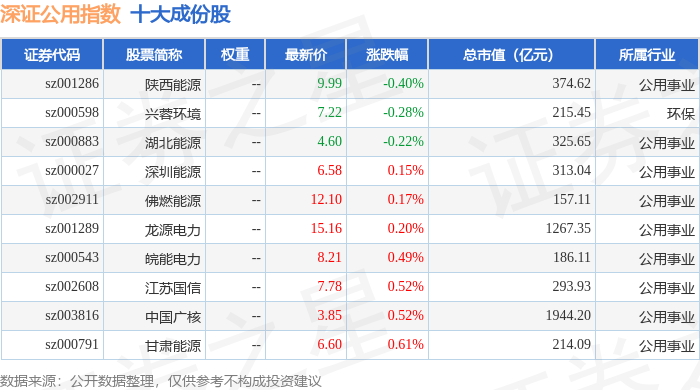 深证公用(399622)指数十大成份股详情如下: