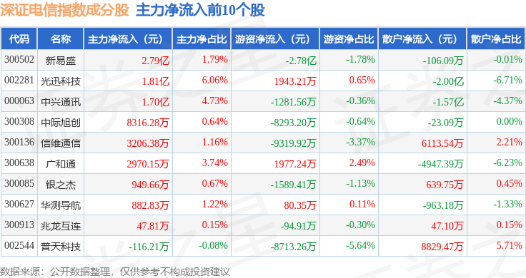 资金流向方面,深证电信(399621)指数成份股当日主力资金净流出合计2211.26万元,游资资金净流出合计4.78亿元,散户资金净流入合计5.0亿元。成份股资金流向详情见下表: