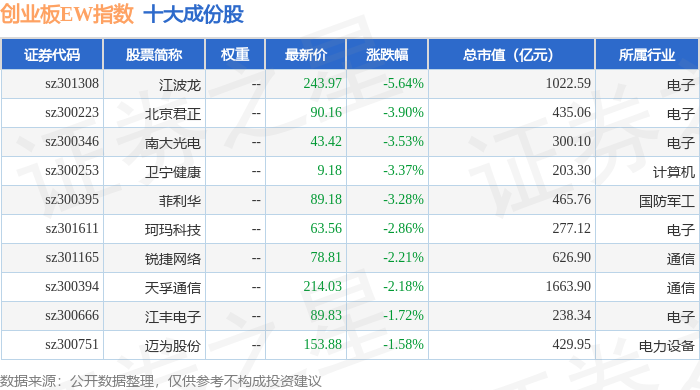 创业板EW(399635)指数十大成份股详情如下:
