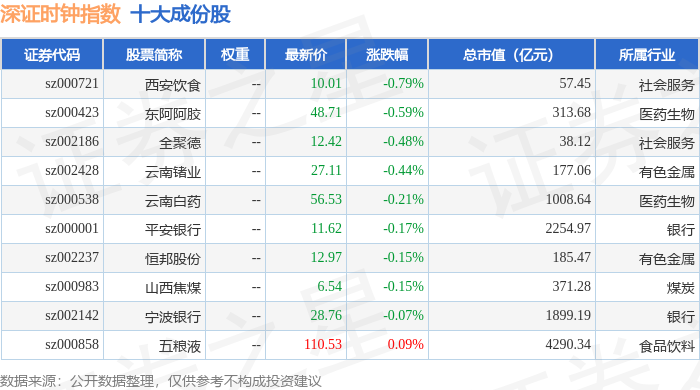 证券之星消息,12月19日,深证时钟(399644)指数报收于3478.62点,涨0.95%,成交515.09亿元,换手率1.64%。当日该指数成份股中,上涨的有91家,西部材料以10.0%的涨幅领涨,下跌的有9家,西安饮食以0.79%的跌幅领跌。
