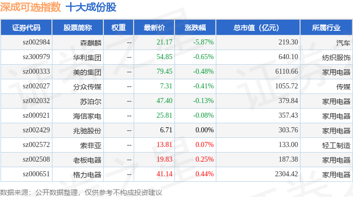 证券之星消息,12月19日,深成可选(399683)指数报收于1879.55点,涨0.65%,成交323.03亿元,换手率2.0%。当日该指数成份股中,上涨的有37家,德赛西威以6.95%的涨幅领涨,下跌的有6家,森麒麟以5.87%的跌幅领跌。