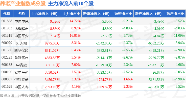 资金流向方面,养老产业(399812)指数成份股当日主力资金净流入合计27.93亿元,游资资金净流出合计15.31亿元,散户资金净流出合计12.62亿元。成份股资金流向详情见下表:
