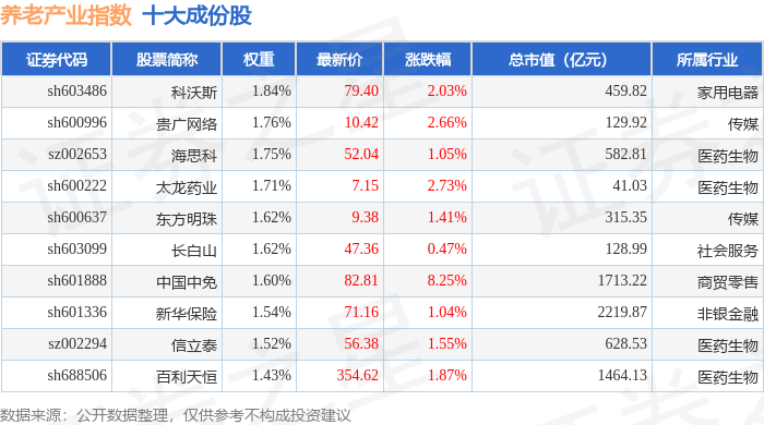 养老产业(399812)指数十大成份股详情如下: