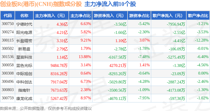 资金流向方面,创业板R(港币)(CNH)(470006)指数成份股当日主力资金净流出合计11.23亿元,游资资金净流出合计6.63亿元,散户资金净流入合计17.87亿元。成份股资金流向详情见下表: