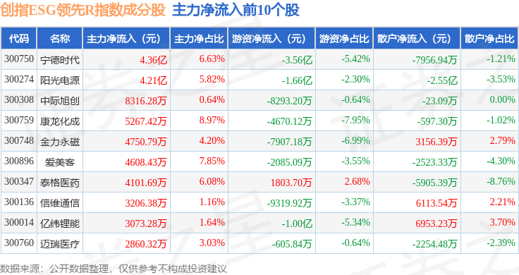 资金流向方面,创指ESG领先R(470031)指数成份股当日主力资金净流入合计2.46亿元,游资资金净流出合计7.46亿元,散户资金净流入合计5.0亿元。成份股资金流向详情见下表: