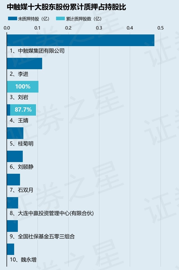 截止本公告日,股东刘岩已累计质押股份1038.08万股,占其持股总数的100.0%,股东王婧已累计质押股份834.0万股,占其持股总数的87.7%。本次质押后中触媒十大股东的累计质押股份占持股比例(占持股比例的计算以公司最新一期财务报表公布的十大股东的持股总数为基准)见下图:
