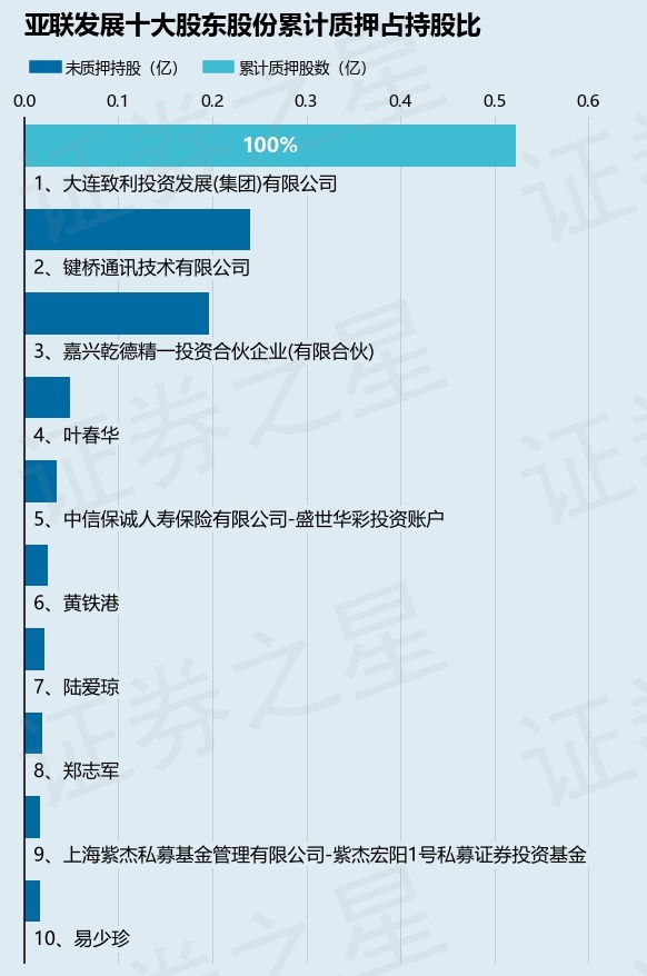 截止本公告日,股东大连致利投资发展(集团)有限公司已累计质押股份5226.0万股,占其持股总数的100.0%。本次质押后亚联发展十大股东的累计质押股份占持股比例(占持股比例的计算以公司最新一期财务报表公布的十大股东的持股总数为基准)见下图: