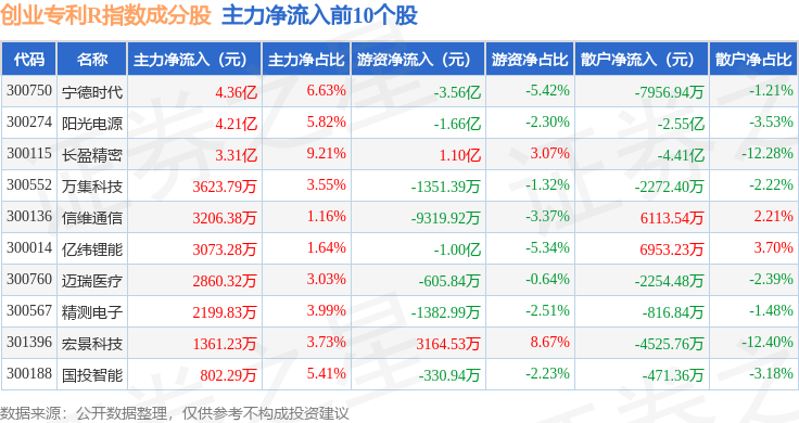 资金流向方面,创业专利R(470068)指数成份股当日主力资金净流出合计1285.01万元,游资资金净流出合计1.46亿元,散户资金净流入合计1.58亿元。成份股资金流向详情见下表: