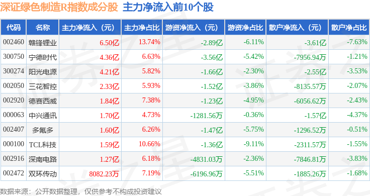 资金流向方面,深证绿色制造R(470069)指数成份股当日主力资金净流入合计19.6亿元,游资资金净流出合计16.94亿元,散户资金净流出合计2.66亿元。成份股资金流向详情见下表: