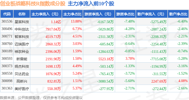 资金流向方面,创业板战略科技R(471004)指数成份股当日主力资金净流出合计9.56亿元,游资资金净流入合计3478.84万元,散户资金净流入合计9.21亿元。成份股资金流向详情见下表: