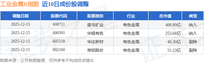 近10日内工业金属R(480043)指数成份股做了调整,新纳入了2只股票,剔除了2只股票。