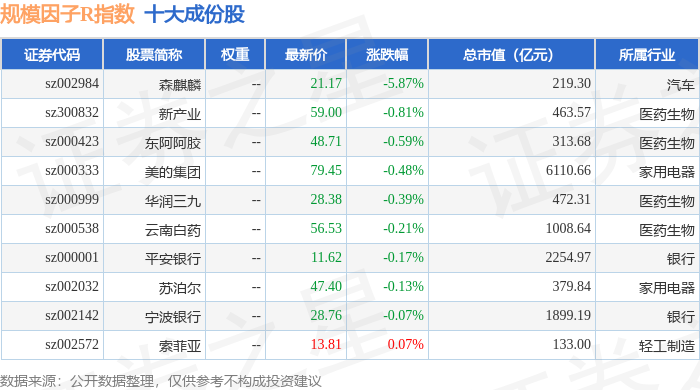 证券之星消息,12月19日,规模因子R(480055)指数报收于2351.89点,涨0.46%,成交194.52亿元,换手率0.91%。当日该指数成份股中,上涨的有41家,浙江永强以5.51%的涨幅领涨,下跌的有9家,森麒麟以5.87%的跌幅领跌。