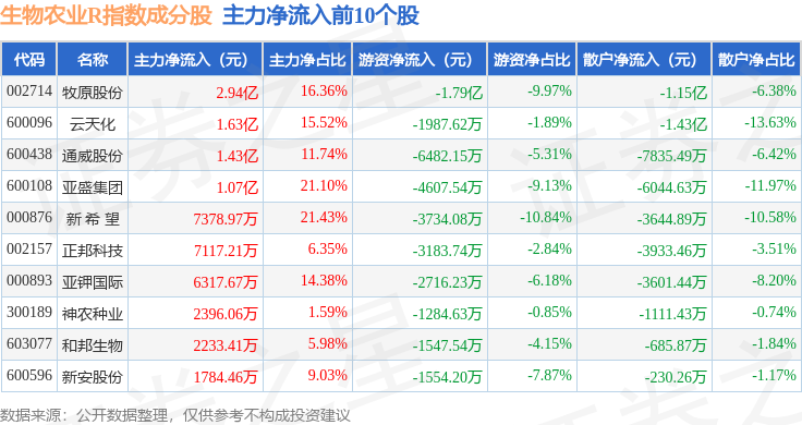 资金流向方面,生物农业R(480072)指数成份股当日主力资金净流入合计6.18亿元,游资资金净流出合计5.37亿元,散户资金净流出合计5898.35万元。成份股资金流向详情见下表: