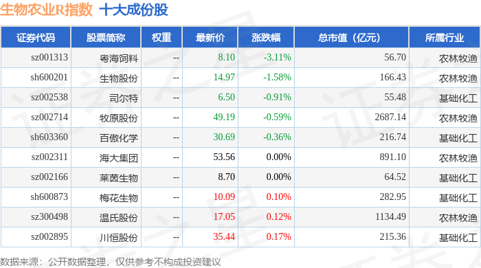 生物农业R(480072)指数十大成份股详情如下: