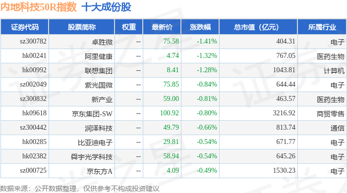 内地科技50R(483003)指数十大成份股详情如下: