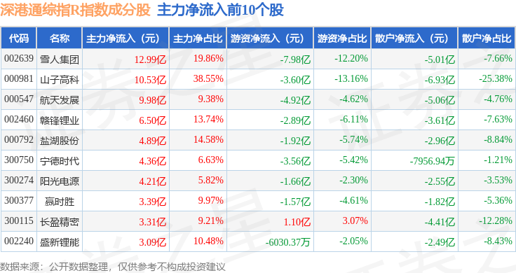 资金流向方面,深港通综指R(483005)指数成份股当日主力资金净流入合计4.85亿元,游资资金净流出合计79.1亿元,散户资金净流入合计74.26亿元。成份股资金流向详情见下表: