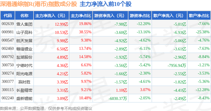 资金流向方面,深港通综指R(港币)(483006)指数成份股当日主力资金净流入合计4.85亿元,游资资金净流出合计79.1亿元,散户资金净流入合计74.26亿元。成份股资金流向详情见下表: