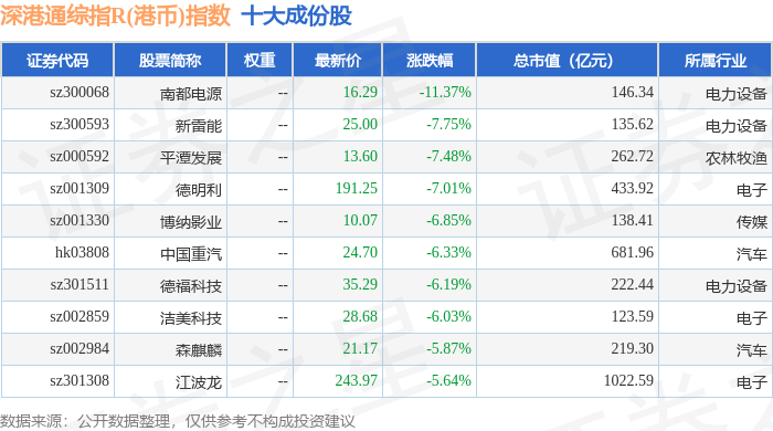 深港通综指R(港币)(483006)指数十大成份股详情如下: