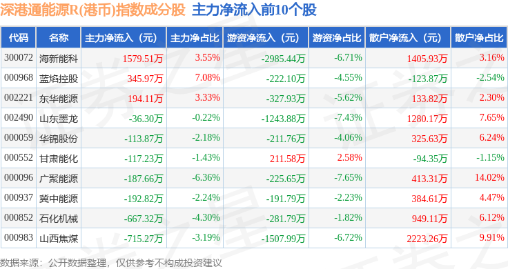 资金流向方面,深港通能源R(港币)(483014)指数成份股当日主力资金净流出合计1.79亿元,游资资金净流出合计9225.18万元,散户资金净流入合计2.72亿元。成份股资金流向详情见下表: