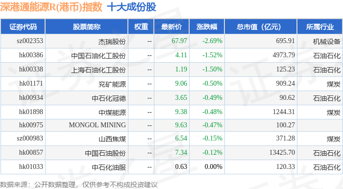 深港通能源R(港币)(483014)指数十大成份股详情如下: