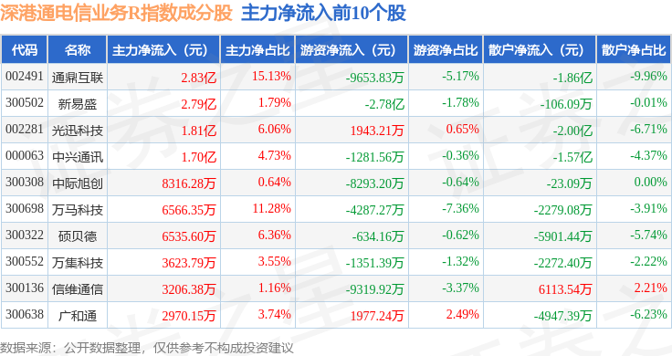 资金流向方面,深港通电信业务R(483029)指数成份股当日主力资金净流出合计8641.07万元,游资资金净流出合计7.93亿元,散户资金净流入合计8.79亿元。成份股资金流向详情见下表: